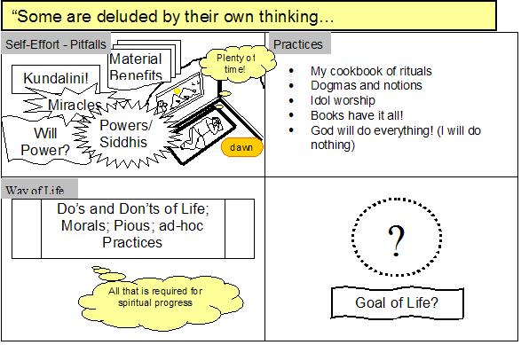 3. The goal is further complicated by the half-baked knowledge obtained from various sources like books, and from multi-traditional worship. Some even adopt hypnotic means of practice and for some the mirage of kundalini is enticing enough to pursue! The way of life is a mere do’s and don’ts of life, that of morals, and leading a pious life. Leading such a life by itself is no doubt good but how much it contributes for spiritual advancement needs to be observed. Further, among the lot of such self-effort souls are also the intellectuals. They think ‘knowing’ and ‘being’ are the same and refuse to dive in or peep in to Reality, and hence are happy ‘knowing’ from the books. Seminars and discussions are no good when they are not duly supplemented by proper sadhana.