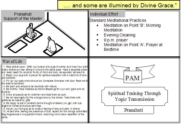 7. In PAM, the support of the Master comes in the form of yogic transmission called Pranahuti. “Power of transmission is a yogic attainment of a very high order by which a Yogi can infuse by his own will force the Yogic energy or Godly effulgence within any one and remove anything unwanted in him or detrimental to his spiritual progress” [SS Pg 227, Basanth 2004 edition].