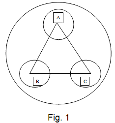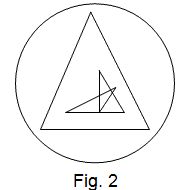 There is a big circle in which there is a big triangle at the three ends of which there are small triangles which are formed in their respective circles. The big circle is the substratum or the Base. It is the big fourth state. The circles of the remaining triangles are the respective fourth conditions of those triangles. The circle of the triangle A is Brahman: the circle of the triangle B is Jiva, and the circle of the triangle C is Prakriti (nature). These triangles are drawn only for the purpose of explanation. In fact, the triangle of the Brahman surrounds all including its circle. The triangles of Jiva and Prakriti are also in it in the middle. Brahman is high above, and the inert matter (Prakriti – Nature) is below. The idea can be pictured (sketched) thus: A is Brahman, B is Jiva and C is Nature (Prakriti0, These three triangles are ordinary. D is a big triangle in which all the three triangles exist. This is Para Brahman. The circle H is the Base Adhara, or the Substratum, Adhistana.