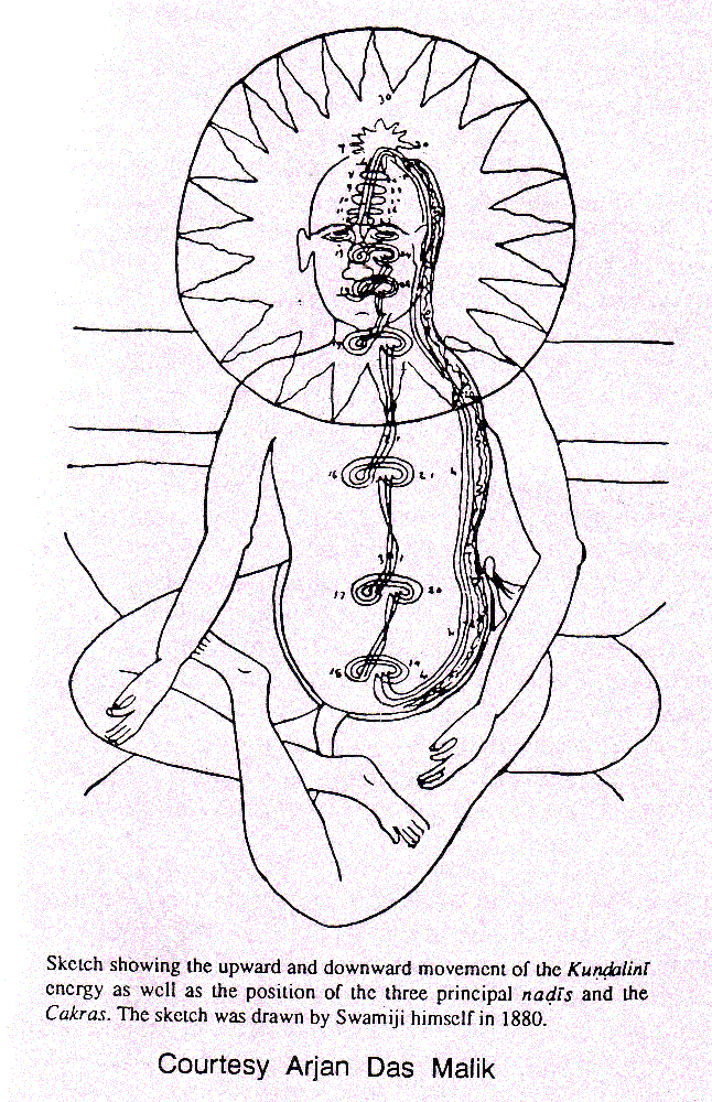 "Another important feature which lay undiscovered so far relates to the passage of the Kundalini-force through the spinal column. Ordinarily by Hatha Yoga the awakened Kundalini-force takes a straight passage through the spinal column from one end to the other. The awakened energy, which in ordinary course should have come into action through its top-most point at the base of the Sahasrara, is impeded on account of the unpurified state of the point. Thus it does not connect itself with the subtle state of the Sahasrara but gets diverted towards lower planes of materialism. In Rajayoga the Kundalini force goes with a bow-like curve with almost a hair-breadth curvature at the centre. This keeps the power confined to its proper natural course leading to finer states of subtleness. In this case, the transformation goes on automatically resulting in the removal of grosser elements there from. Under the circumstances, there is no risk of wrong diversion or misuse." Master stated in a letter to Dr. K.C.V. (9/9/1964) that " I may tell you that in our system of sadhana the three chakras, the Nabhi, the Swadhisthana and the Mooladhara are taken up at the very end in quite a natural course. Rather I may say that Nature herself takes them up then."